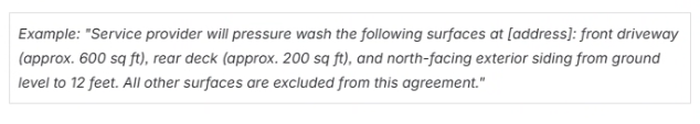 This is the most important clause — and the most commonly written too vaguely. Don’t write “pressure wash the house.” Be explicit: